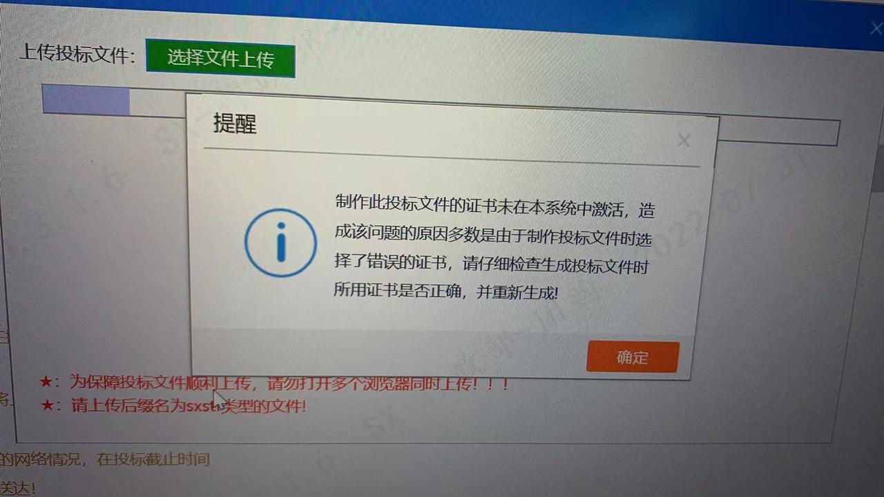 陕西省平台上传投标文件时提示:制作此投标文件的证书未在本系统中激活 发布日期 2024-06-12 浏览量 0 标签 投标,导入清单,拷贝失败 Body 解决办法:该问题是因为用法人锁上传文件的错误提示,应换主锁或副锁生成文件并上传 Cover Knowledge Category 平台 Platform 陕西省平台