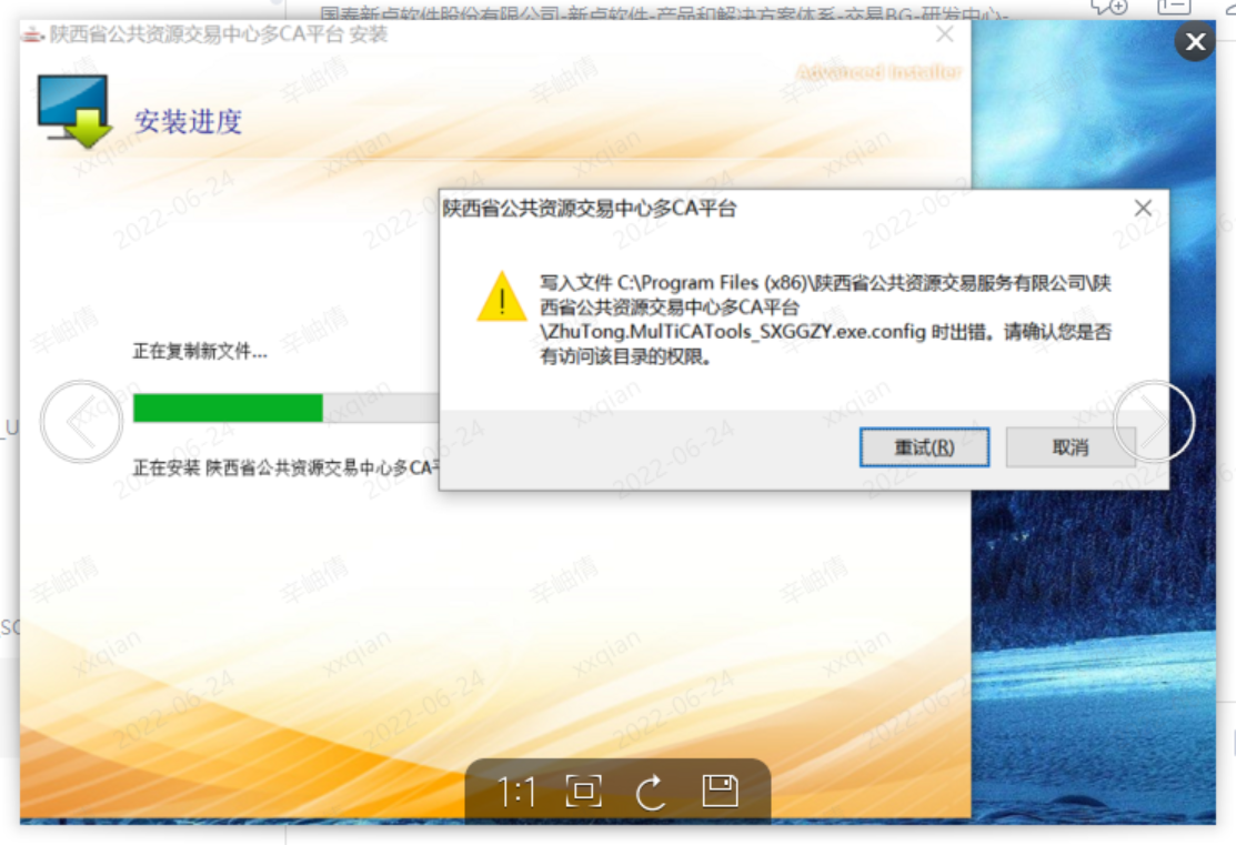 陕西省平台多ca 安装提示:是否有访问该目录的权限 发布日期 2024-06-12 浏览量 0 标签 投标,导入清单,拷贝失败 Body 解决办法:该问题是因为C盘无法访问,无权限,可在安装过程中更换目录选择D盘或其他盘安装,如果更换完还是无法完成安装需要公司运维处理权限问题 Cover Knowledge Category 西部CA Platform 陕西省平台