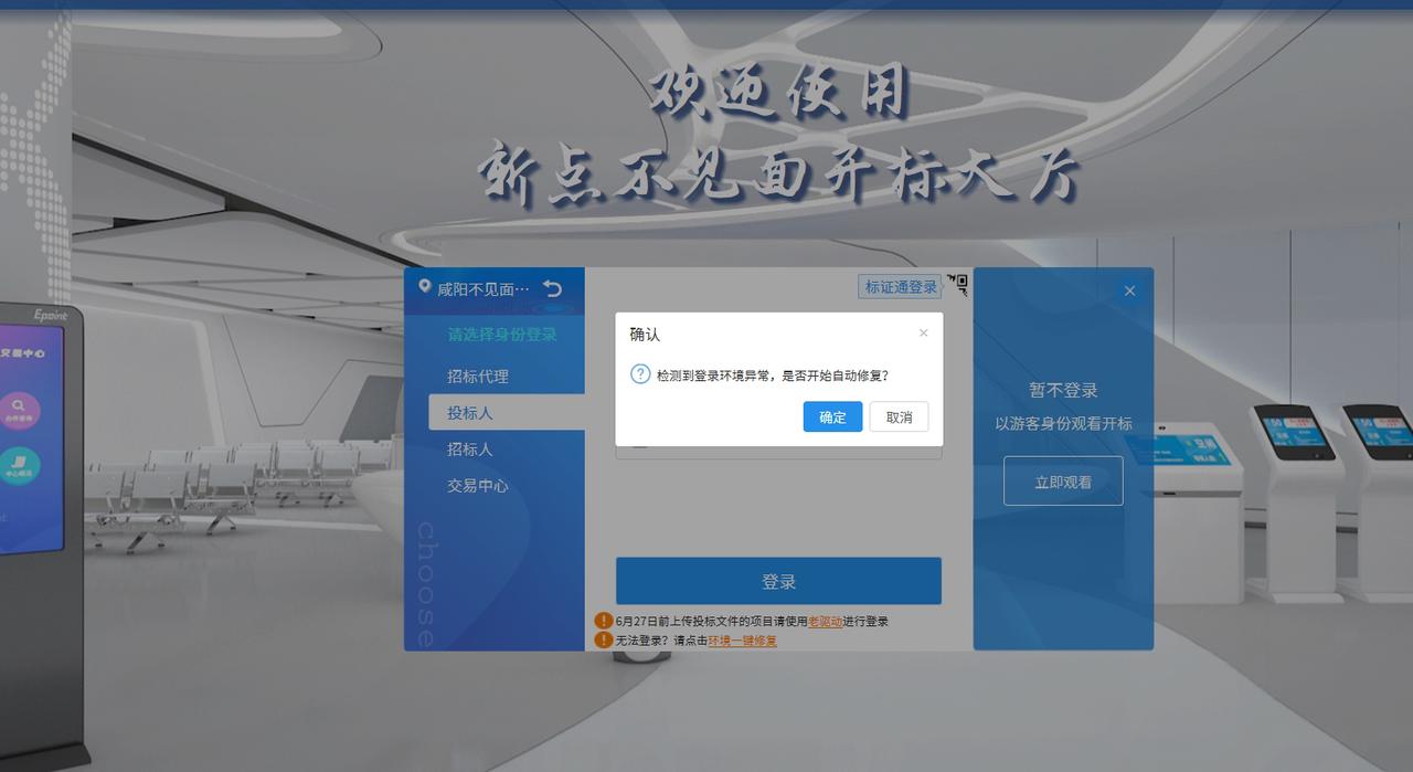 陕西省平台咸阳不见面开标进不去提示:检测到登录环境异常,是否开始自动修复 发布日期 2024-06-12 浏览量 0 标签 投标,导入清单,拷贝失败 Body 解决办法:需要安装新点播放器 Cover Knowledge Category 平台 Platform 陕西省平台