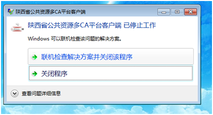 陕西省平台多CA互认系统客户端安装后无法打开,提示已停止工作 发布日期 2024-06-12 浏览量 0 标签 投标,导入清单,拷贝失败 Body 解决办法:此问题是因为首次安装时未退出杀毒软件,程序被拦截,需先全部卸载,关机重启后关掉杀毒软件重新安装。 Cover Knowledge Category 西部CA Platform 陕西省平台