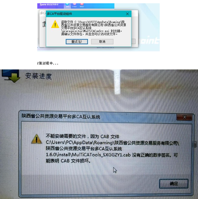 陕西省平台安装CA互认系统时,提示:CAB文件及MulTiCAComSrv出错