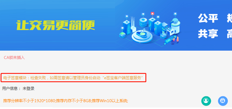 招采通平台启动后,电子签章模块显示检查失败 发布日期 2024-06-12 浏览量 0 标签 投标,导入清单,拷贝失败 Body 退出E签宝客户端,重新以管理员身份启动E签宝客户端。完成 后点击刷新按钮。 Image Image Image Cover Knowledge Category 电子签章 Platform 招采通平台