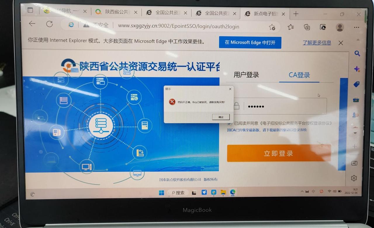 陕西省平台登录提示:密码不正确,Key已被锁死! 发布日期 2024-06-12 浏览量 0 标签 投标,导入清单,拷贝失败 Body 解决方法:如果密码确认正确,可能是驱动安装有问题,重新安装多CA驱动 Cover Knowledge Category 平台 Platform 陕西省平台