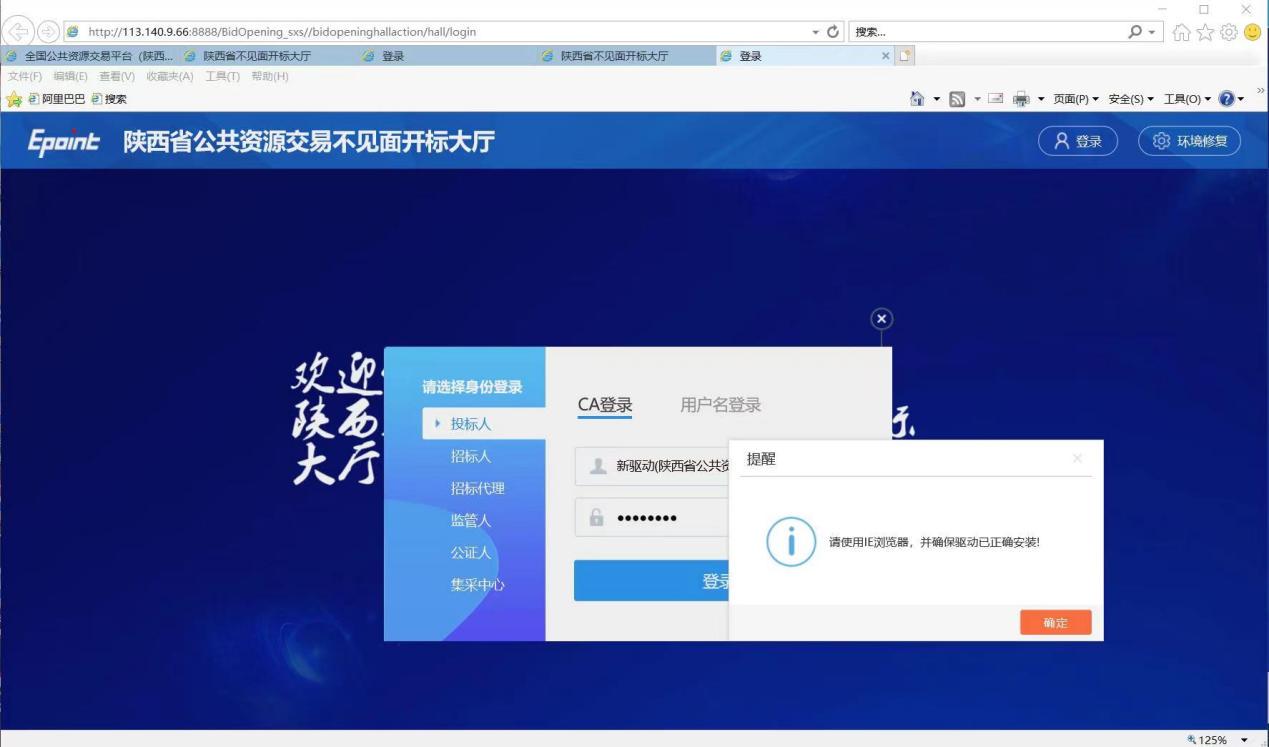 陕西省平台进入不见面开标大厅时提示:“请使用ie浏览器,并确保驱动已正常安装” 发布日期 2024-06-12 浏览量 0 标签 投标,导入清单,拷贝失败 Body 解决办法:在该页面复制网址,添加受信任站点 Cover Knowledge Category 平台 Platform 陕西省平台