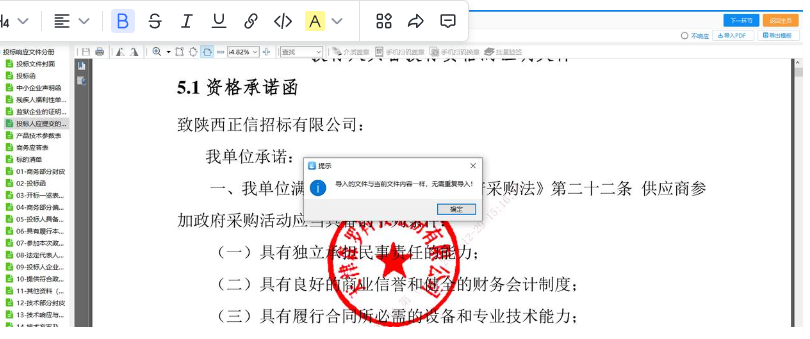 陕西政府采购网使用投标响应客户端制作标书导入新文件时,提示:导入的文件与当前文件内容一样,无需重复导入! 发布日期 2024-06-12 浏览量 0 标签 投标,导入清单,拷贝失败 Body 解决方法:此问题需要先导入其他文件,覆盖后再导入需要导入的文件 Cover Knowledge Category 政府采购投标客户端 Platform 陕西政府采购网
